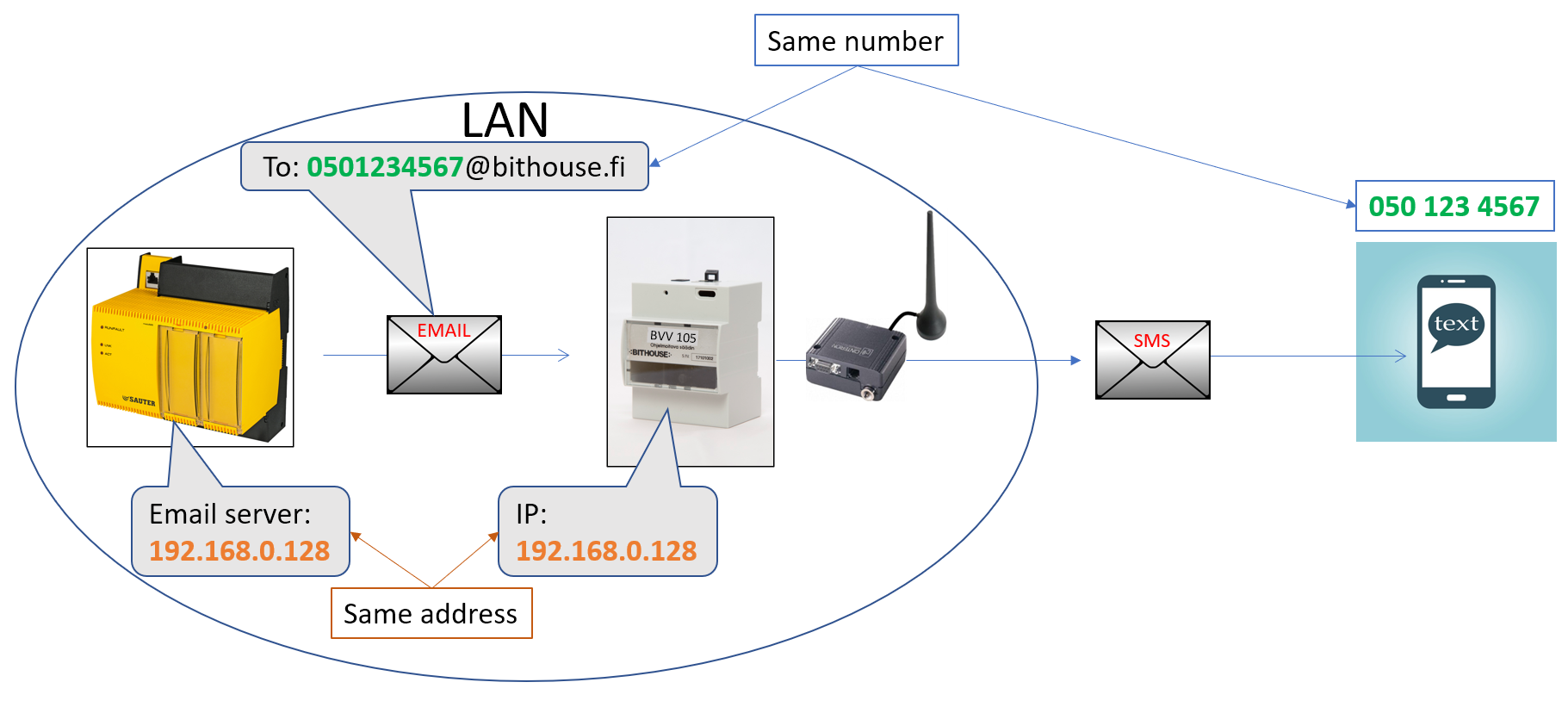 The Magio BVV SMS converter converts an e-mail sent by the automation system into an SMS. It has a built-in 4G modem, so a separate SMS modem is no longer needed.